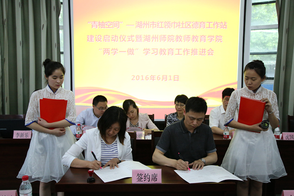 为进一步提高“两学一做”学习教育的实效性,推进湖州市“结对共学共做 携手共建共进”活动,教师教育学院党委根据省委省政府《关于全面加强中小学德育工作的若干意见》文件精神,围绕立德树人根本任务,开展“青柚空间——红领巾社区德育工作站”建设。6月1日下午,项目启动仪式在余家漾社区举行。市文明办、团市委、市教育局基教处、吴兴区文明办、吴兴区团区委、飞英街道和我校文明办、团委、教师教育学院相关负责人,教师教育学院学工办、分团委、学生党支部负责老师,第一批建设单位的党组织书记、大学生志愿者代表、社区家长代表、少先队员代表参加此次活动。