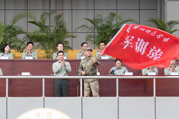 丁敢真向军训旅授旗,并宣布2024级新生军事训练正式开始。